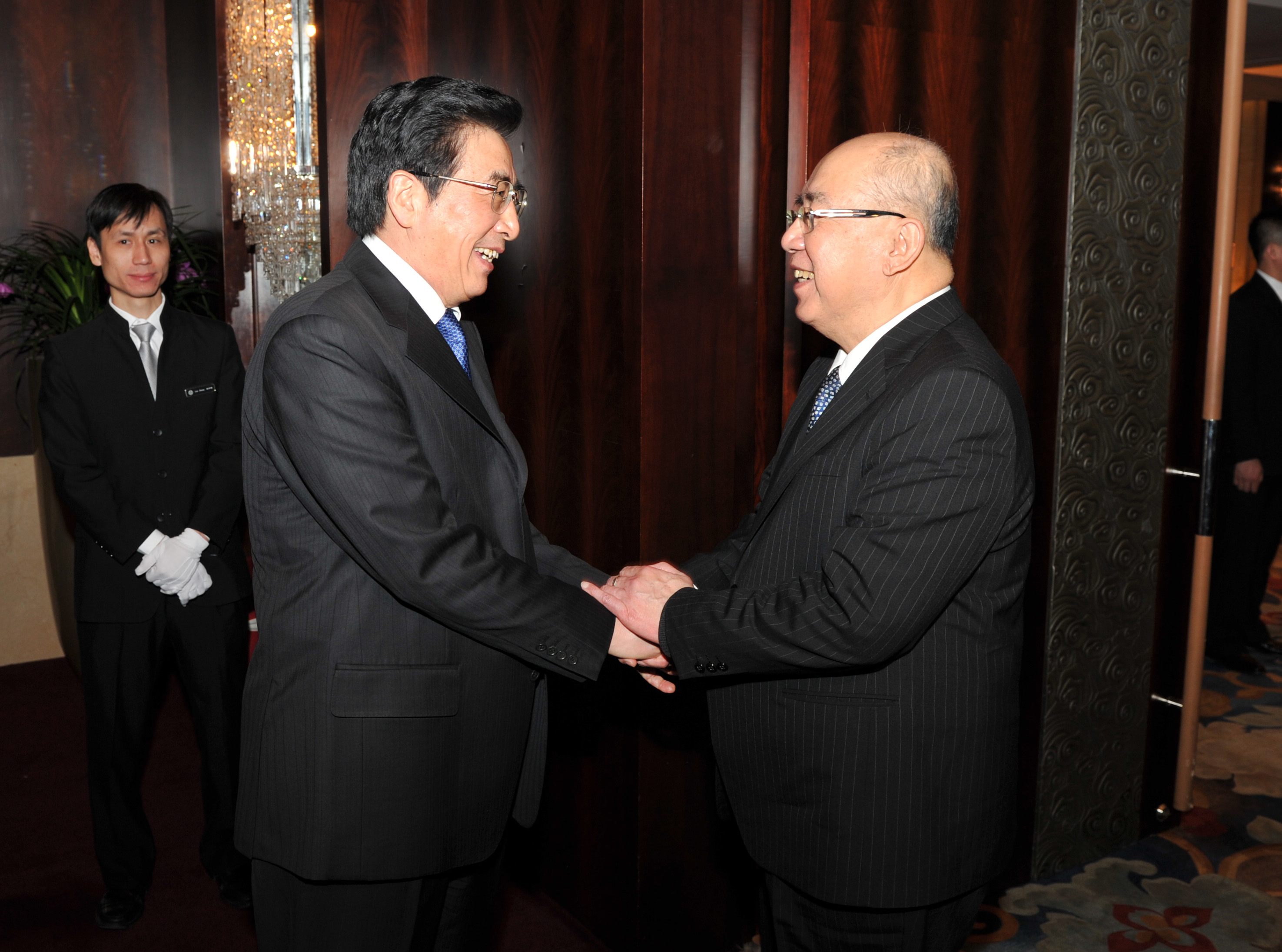 中共北京市委副书记、市长郭金龙与中国国民党荣誉主席吴伯雄亲切握手互致问候(丁磊 摄)