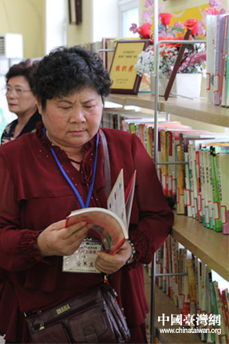 来自高雄小港团的团长黄美玉在北京市麦子店枣营北里社区图书馆参观。(中国台湾网 郜利敏 摄)