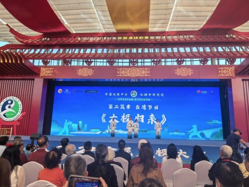 在开幕式上,台湾同胞上台表演《太极归来》,舒展的招式、轻盈的步伐、行云流水的动作,诠释了太极拳刚柔相济、绵延不断的精髓。太极名家见面会期间,台湾同胞与太极拳爱好者面对面交流、手把手教学指导,共同感受太极韵味与魅力,共同书写新时代太极文化新篇章。台湾同胞与太极拳相关协会、太极拳研究学者、家庭代表等深入对话研讨,共同分享技艺传承与创新、推广传播路径及文脉延续故事。丰台武协30余人与台湾同胞在北京园博园展演现场共同展示了精彩的太极拳、太极扇、太极棍等武术表演,同台表演了太极拳《八法五步》,共同传承和发扬中华武术。