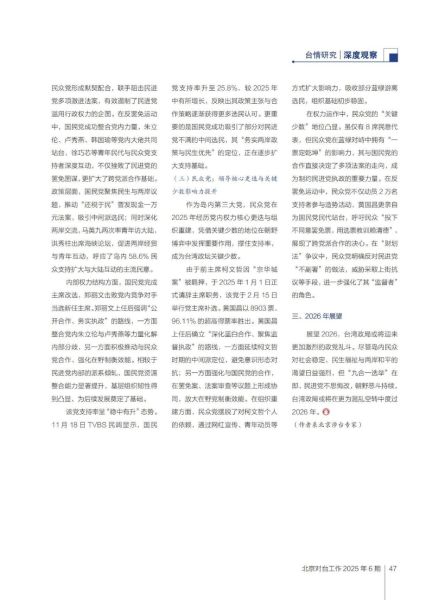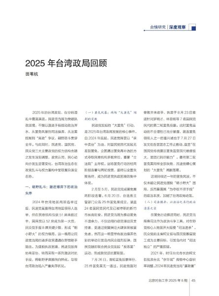 2025年的台湾政坛,在空转混乱中震荡演进。民进党当局为突破执政困境,不惜以激进手段搅动政治浑水,从罢免风暴到“司法”操弄,从法案抵制到“宪政”争议,朝野恶斗贯穿全年。与此同时,民进党、国民党、民众党三大主要政党的权力结构也随之发生深刻调整,政党认同、民心动向亦发生显著变化,台湾政治生态在政党乱斗与权力重构中呈现复杂演变态势。
