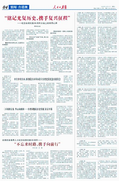 1945年10月25日,台湾光复,重回祖国怀抱。在台湾光复80周年的历史性时刻,党和国家设立台湾光复纪念日。25日上午,纪念台湾光复80周年大会在北京隆重召开。与会的港澳台同胞、海外侨胞代表纷纷表示,要铭记抗战胜利、台湾光复的光荣历史,继承和发扬爱国主义传统和伟大抗战精神,为实现祖国完全统一、民族伟大复兴而共同奋斗。