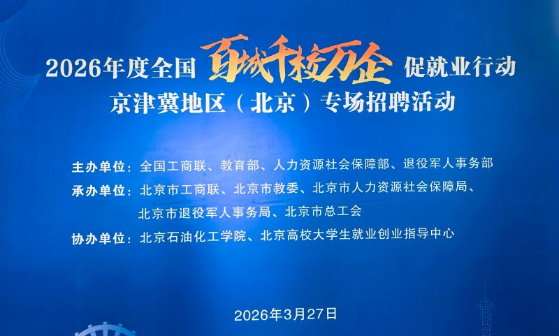 3月27日上午,由北京市工商联、市教委、市人力资源社会保障局、市退役军人事务局、市总工会等单位共同举办的2026年度全国“百城千校万企”促就业行动京津冀地区(北京)专场招聘活动在北京石油化工学院(清源校区)体育馆举办。